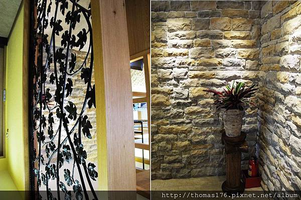店內以木頭、石磚、鐵花為主要元素,座位與座位間有簡單的隔間,可以添增一些隱私感。