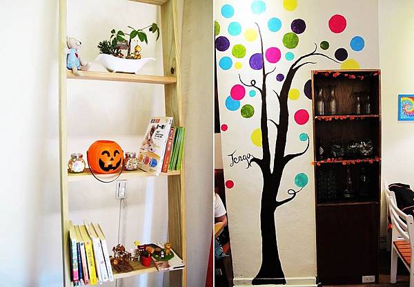 店內以一些小物、擺飾作為裝飾,另外還有牆上繽紛的七彩塗鴉。