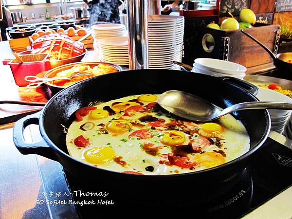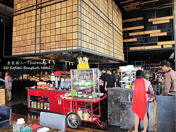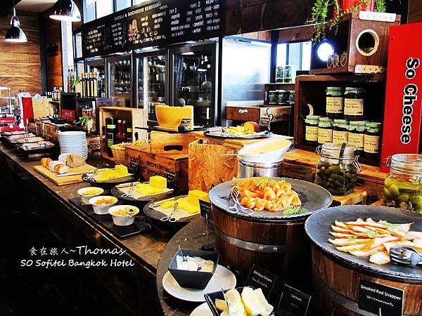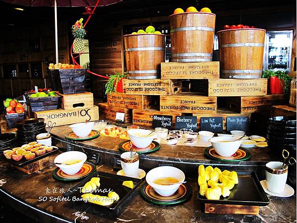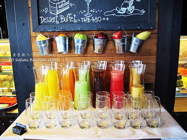 接待人員親切的詢問幾位,帶到座後區後會詢問需要茶、咖啡或飲料,另外會詢問房間號碼,然後就可以來餐點區逛逛囉!曼谷索菲特早餐有著當地的濃濃熱情,加上法式悠閒~從生菜沙拉、水果、熱食、煙燻生食、牛奶、水果吧、果汁吧、咖啡吧、麵包甜點、冰淇淋等都準備周全。