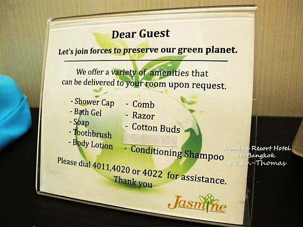為了環保愛地球,落實綠色旅遊~茉莉花渡假飯店沒有主動提供一次性的盥洗用品和個人用品喔,諸如:浴帽(Shower cap)、沐浴乳(Bath gel)、洗髮精(Shampoo)、護髮乳(Conditioning)、香皂(Soap)、牙刷(Toothbrush)、身體乳液(Body Lotion)、梳子(Comb)、棉花棒(Cotton buds)、刮鬍刀(Razor)等,打個電話就會送到房間了。