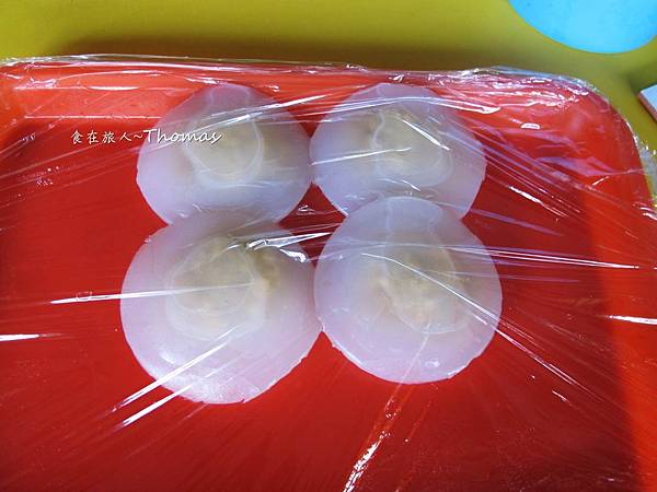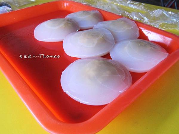 接下來這神秘的為透明圓形物品包著簡單內餡的物品是什麼!?沒錯!就是主角「涼肉圓」,一份基本上就是兩顆...(是我個人都點兩顆啦!單顆點也可以$25,兩顆就是$50~當我講廢話!)