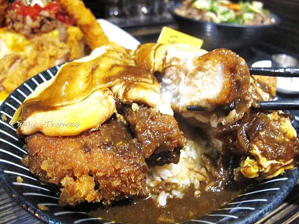 豬排控必點!「極厚切黑咖哩起司豬排丼」~4公分厚切炸豬排,咖哩醬汁可以選擇甘甜或微辛(辣),加上起司與溫泉蛋,飯量也是大滿足。