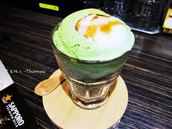 飯後必點「溫泉蛋冰淇淋」,溫泉蛋黃遇到冰淇淋,產生的口感真的很棒!抹茶冰淇淋~鹹鹹甜甜(有奶蓋的口感),杯底還有早餐巧克力脆片,跟冰淇淋一起吃,好順口。