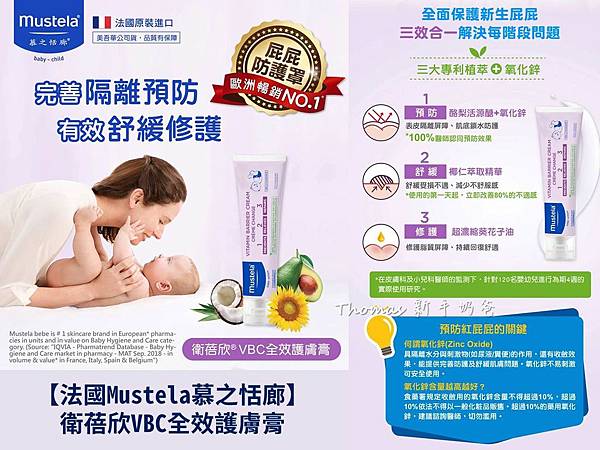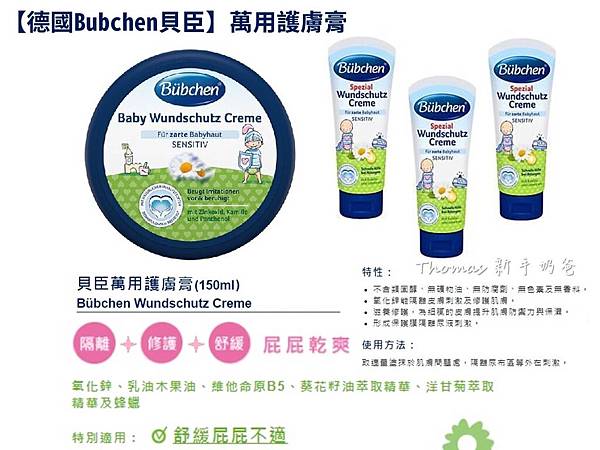 湯瑪仕大叔身為新手奶爸,面臨的是嬰兒每日日常:肚子餓~要喝奶奶、便便尿尿~換尿布、哭哭鬧鬧~無解!湯瑪仕特別整理網路上的資料,寫了一篇嬰兒屁屁膏、護膚膏文章,包含國內外知名嬰兒品牌,「法國Mustela慕之恬廊~衛蓓欣VBC全效護膚膏」、「德國seba med施巴~嬰兒護疹修護膏」、「丹麥Derma~寶寶有機舒敏萬用膏」、「澳洲Grahams珂然~嬰兒異敏屁屁霜」、「德國Penaten牧羊人~嬰幼兒萬用乳霜」、「德國Baan貝恩~嬰兒全效護膚膏」、「德國Bubchen貝臣~萬用護膚膏」、「美國Desitin~尿布疹漿」、「台灣雪芙蘭CHARM BABY親貝比~嬰幼兒舒緩護膚膏」、「義大利chicco~寶貝嬰兒全效護膚膏」等。資料整理自網路,資料可能因個人理解而有不同,個人覺得只有膚質是否適合,使用前建議先向醫生、藥師諮詢。※預防保護>舒緩修護>看醫生治療,請各位爸比媽咪隨時注意小朋友的狀況與反應唷!