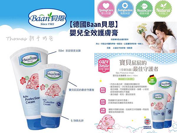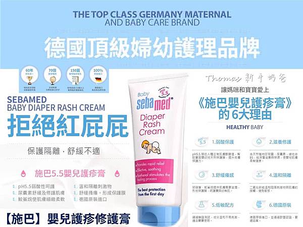 施巴屁屁膏來自德國,也是護理師推薦給湯瑪仕大叔的其中一個款。這個品牌相信大家也不陌生,早期廣告最常出現的pH5.5,施巴是全球第一個生產 pH5.5,不含皂鹼的潔護膚產品的原創品牌。施巴屁屁膏擦起來有點香香的,主打:含天然植物甘菊露、尿囊素,維他命 B5,能深層滋養與保濕,使嬰兒肌膚柔嫩健康;卵磷質、鮫鯊烷提供肌膚需要滋潤,形成保護膜,呵護寶貝幼嫩肌。