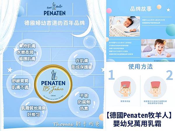 這個牌子相信許多人都不陌生,除了嬰幼兒萬用乳霜外,它的牧羊人泡澡精油也是許多媽媽們推薦的唷。德國嬰幼兒照護 No.1 Penaten牧羊人,德國媽咪首選的百年品牌,嬰幼兒萬用乳霜的主要成分:羊毛脂、泛酰醇、尿囊素、金縷梅提取液、氧化鋅等;除了用在寶寶尿布疹、濕疹、日常護理外,如果皮膚乾裂也可以用來濕潤唷!