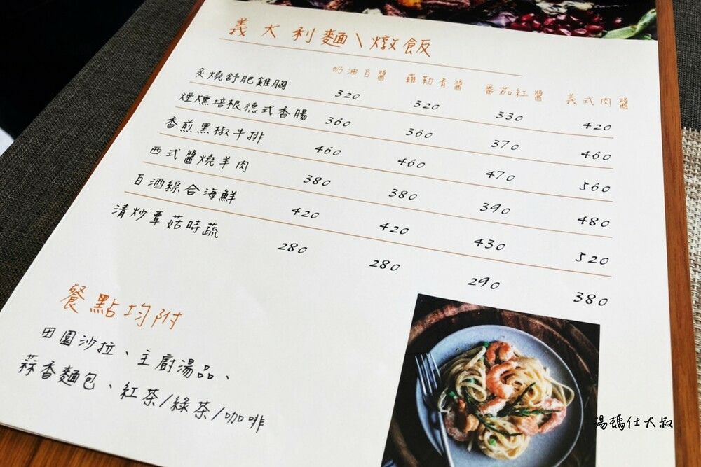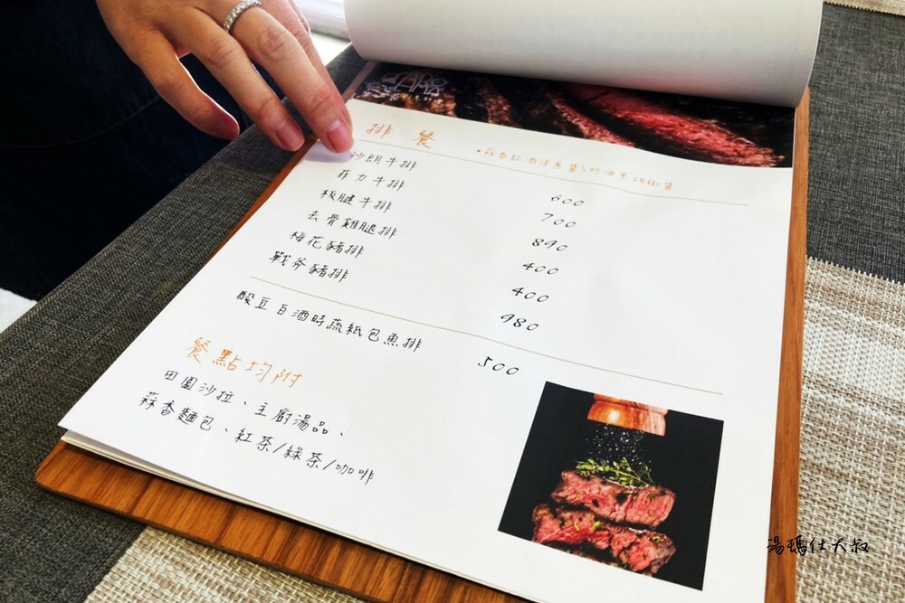 店員推薦的主要是排餐-牛排系列、戰斧豬排,再來就是義大利麵/燉飯系列,都附有沙拉、濃湯、麵包、飲料(紅茶、綠茶、美式咖啡擇一)。