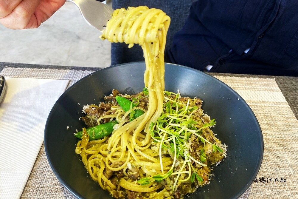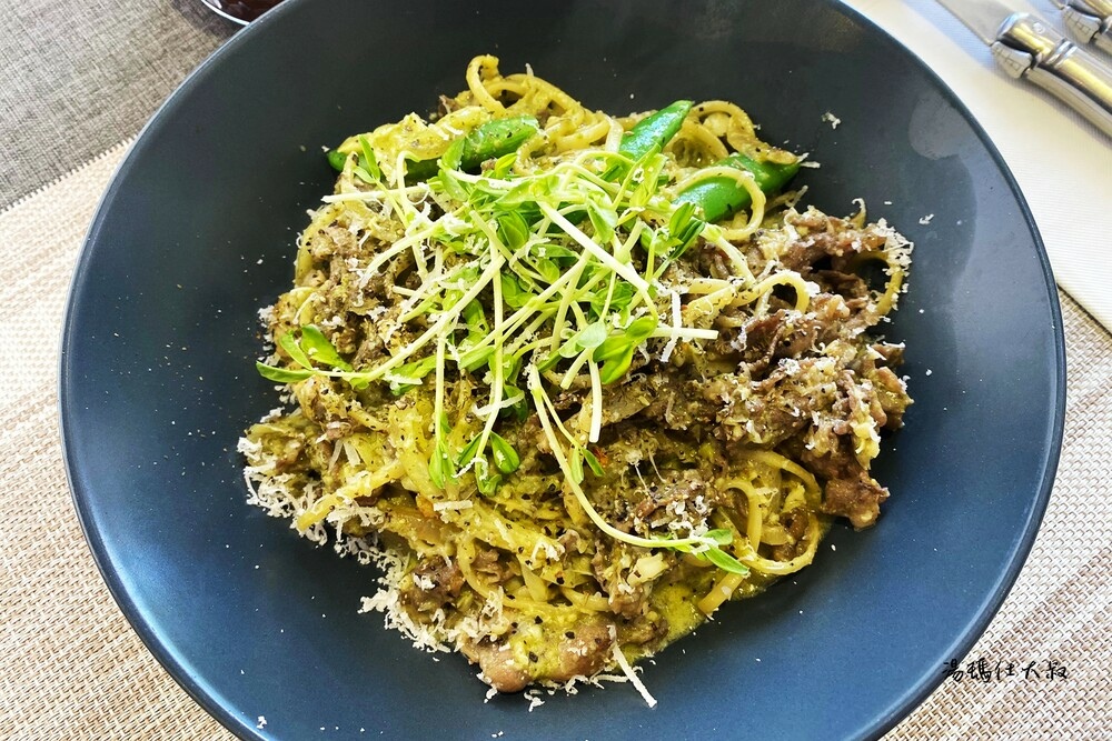 湯瑪仕第一次嘗試的西式醬燒羊肉義大利麵-羅勒青醬。