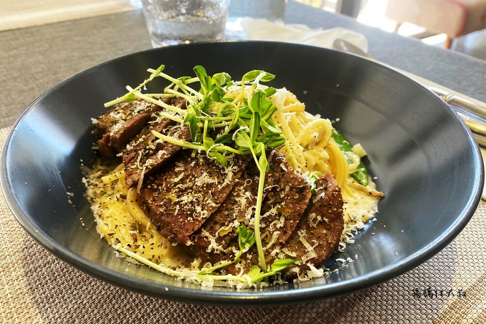 登登登...主餐上桌啦!友人點的香煎黑椒牛排義大利麵-奶油白醬。